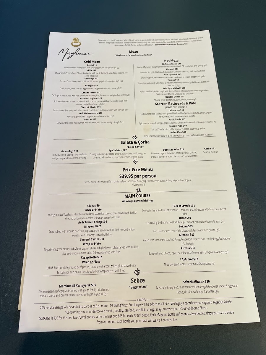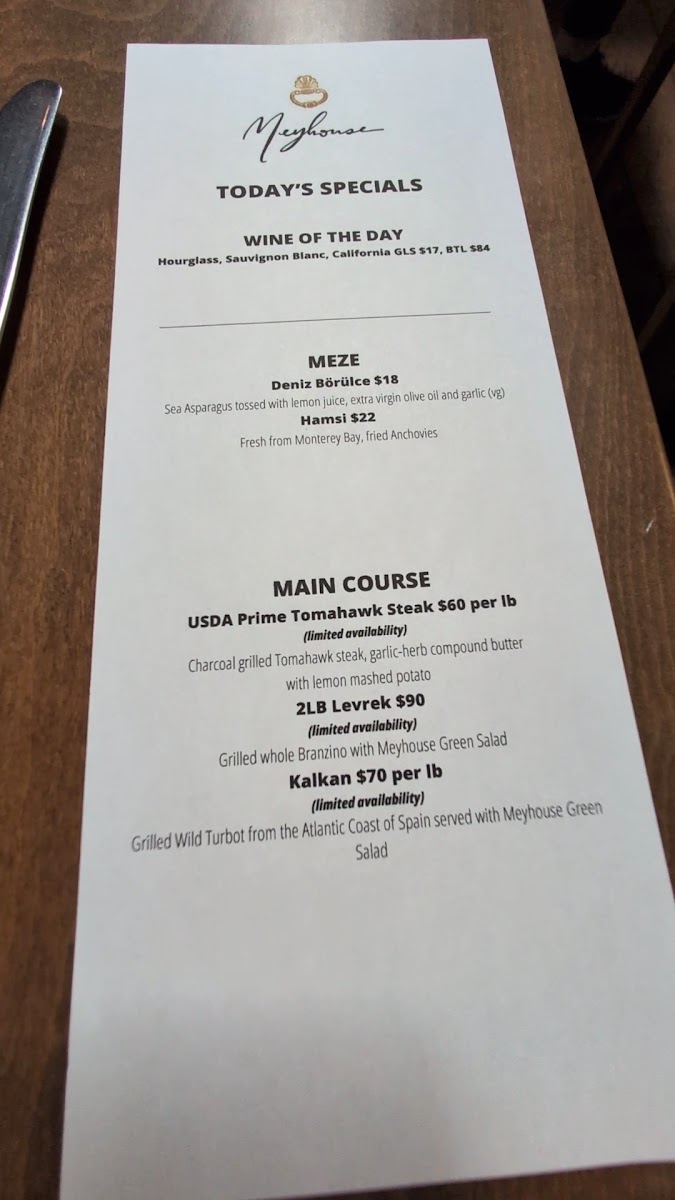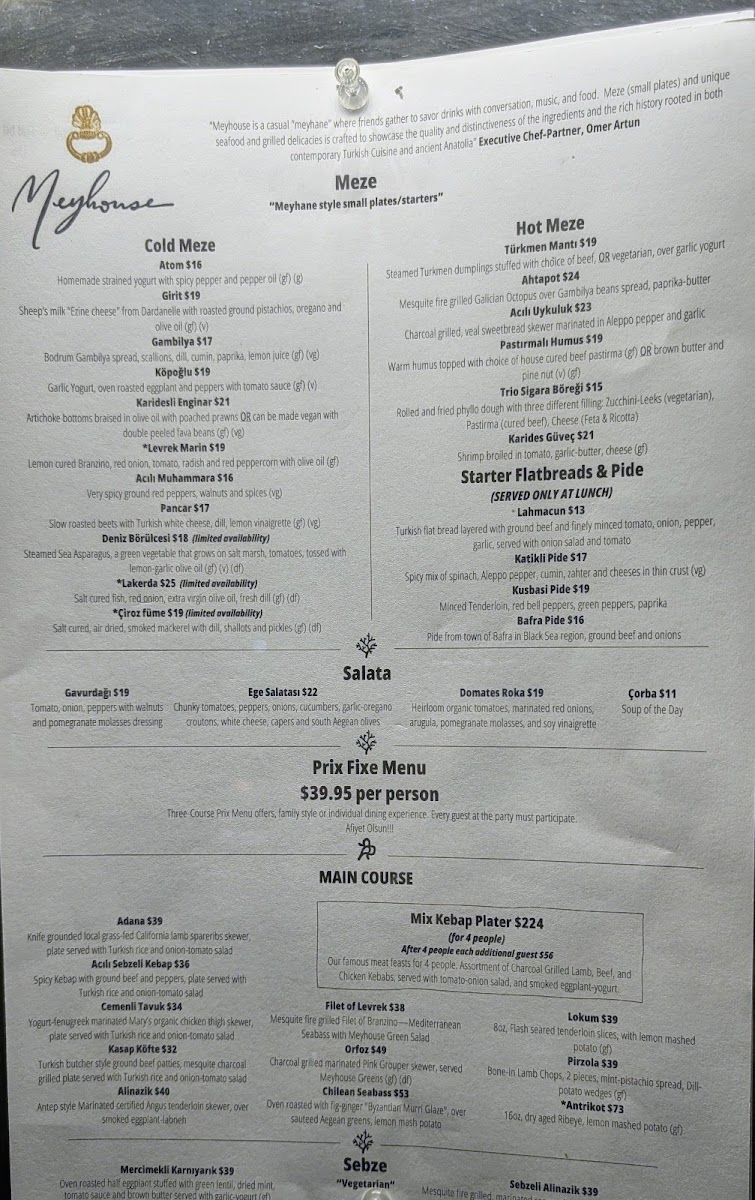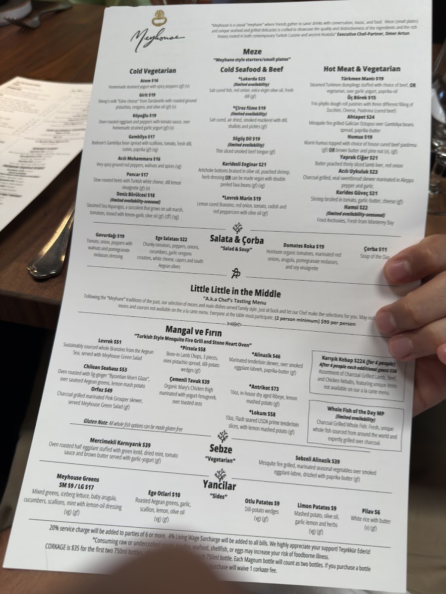 At Meyhouse & Meyhouse Jazz Club (640 Emerson St, Palo Alto), the menu reads like a confident tour through Aegean-inspired flavors-built for sharing, lingering, and pairing with a serious beverage list. I’d start by grazing through the cold vegetarian and salad selections-Atom, Girit, Köpoğlu, Patlıcan Salatası, and Gambilya Fava-then brighten things up with Gavurdağı, Meyhouse Greens, Domates Roka, or Ege Salatası. The hot section keeps the momentum with crowd-pleasers like Türkmen Mantısı, Ahtapot, Pastırmalı Humus, and Yaprak Ciğer. Seafood and beef cold plates-Lakerda, Çiroz Füme, Midye Al Sikbaj, Karidesli Enginar, and Levrek Marin-feel especially on-theme for a night out, while vegetable-forward plates like Cupra and Sebzeli Alinazik round out the table nicely. For mains, the grill (“Mangal”) lineup-Levrek, Lamb Chops, Çemenli Tavuk, Alinazik, and Antrikot-anchors the experience, and the supporting sides (Otlu Patates, Ege Otlari, Limon Patates, Pilav, plus another hit of Meyhouse Greens) make it easy to build a full spread. Dessert is classic and indulgent-Profiterole, Sütlaç, Damla Sakızlı Dondurma, Künefe, and Şöbiyet-with a playful финisher in dessert cocktails like Aegean Fashion, Turkish Coffee Martini, and Armut Likörü. Add in curated wine sections (from 2021 Paloekerisio, Semi-Sparkling Orange Wine to deep “Library” picks) and spirited staples like Efe Blue raki or cocktails such as Bitter Cherry and Cos-Mey-Politan, and the menu ultimately feels designed for a long, jazz-soaked evening: order broadly, share generously, and let the pairings do the talking.