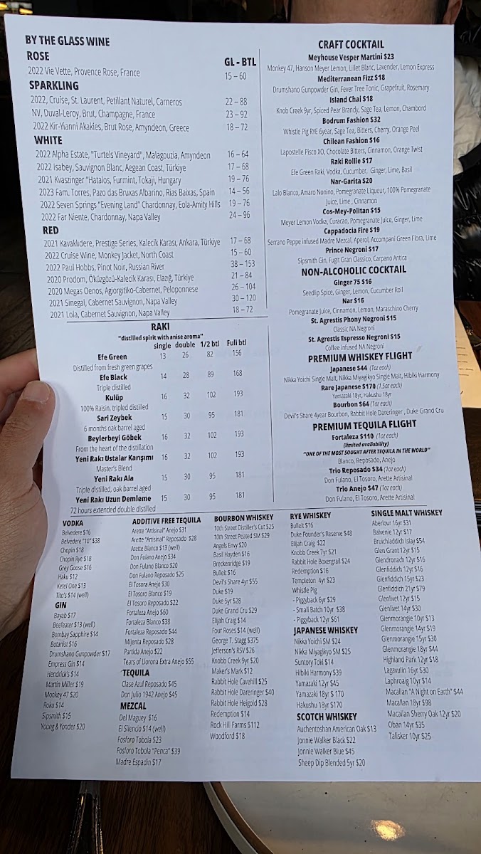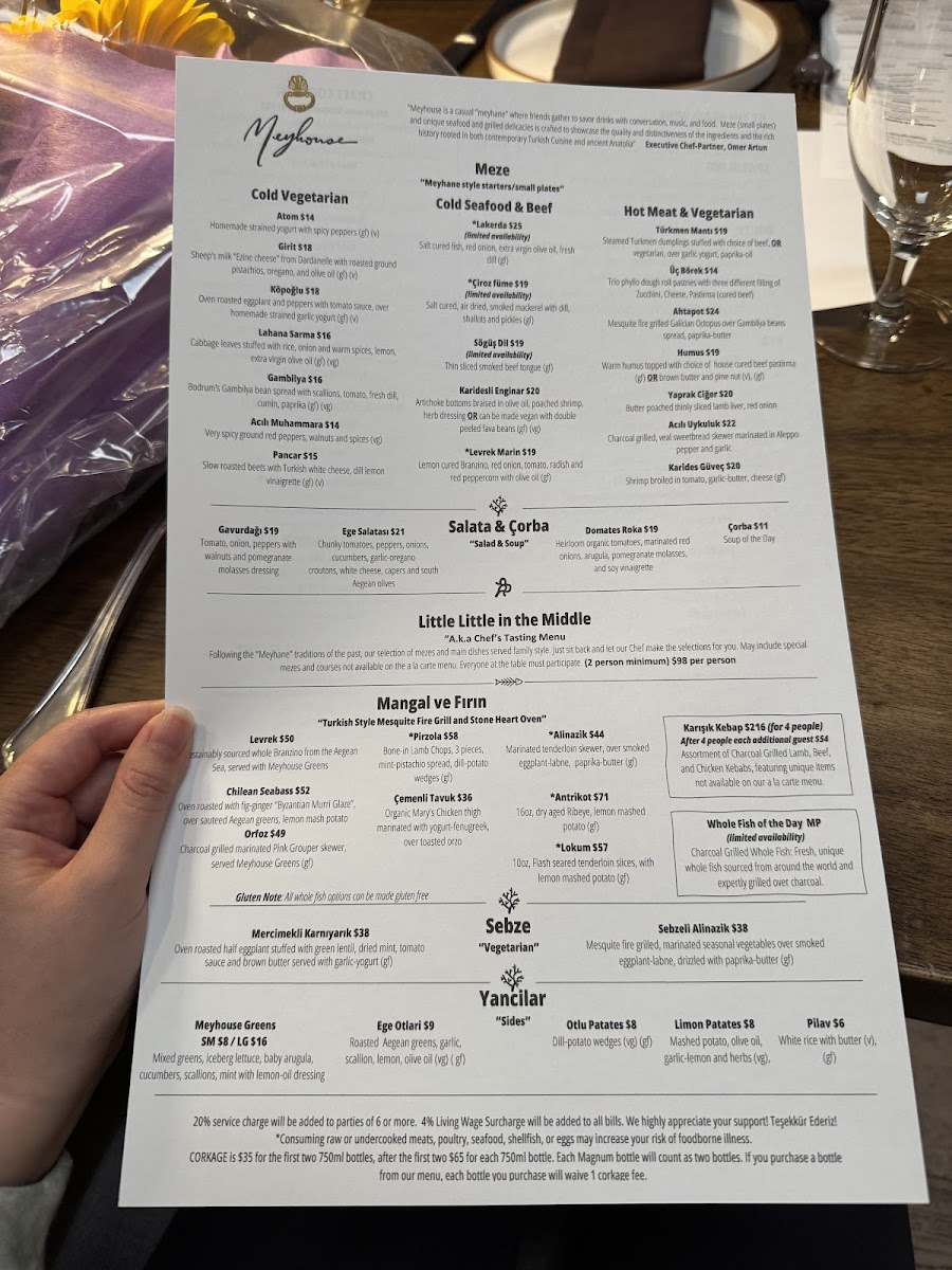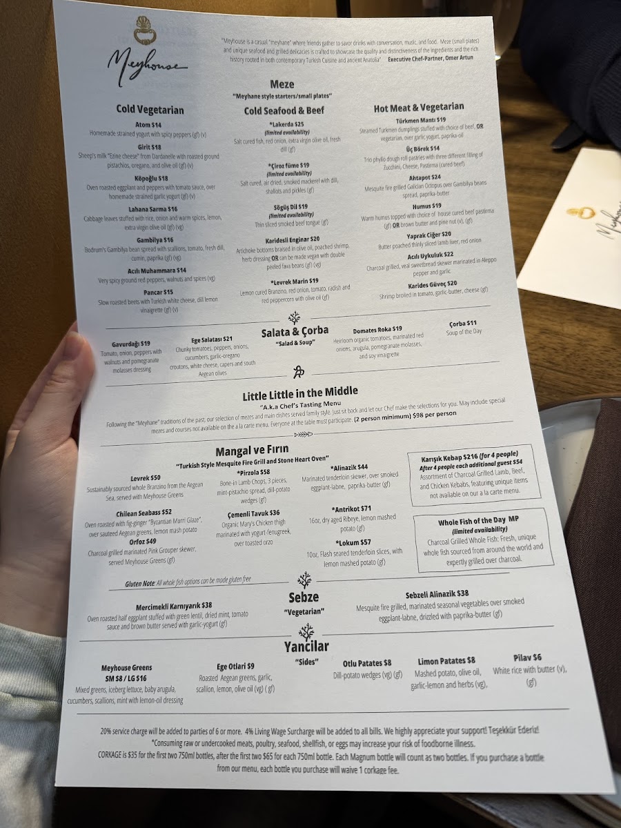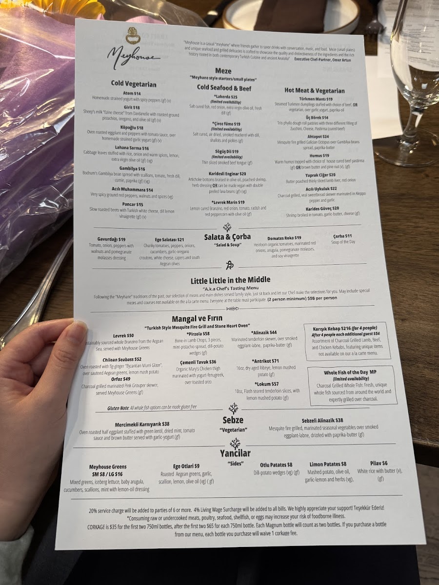 At Meyhouse & Meyhouse Jazz Club (640 Emerson St, Palo Alto), the menu reads like a confident tour through Aegean-inspired flavors-built for sharing, lingering, and pairing with a serious beverage list. I’d start by grazing through the cold vegetarian and salad selections-Atom, Girit, Köpoğlu, Patlıcan Salatası, and Gambilya Fava-then brighten things up with Gavurdağı, Meyhouse Greens, Domates Roka, or Ege Salatası. The hot section keeps the momentum with crowd-pleasers like Türkmen Mantısı, Ahtapot, Pastırmalı Humus, and Yaprak Ciğer. Seafood and beef cold plates-Lakerda, Çiroz Füme, Midye Al Sikbaj, Karidesli Enginar, and Levrek Marin-feel especially on-theme for a night out, while vegetable-forward plates like Cupra and Sebzeli Alinazik round out the table nicely. For mains, the grill (“Mangal”) lineup-Levrek, Lamb Chops, Çemenli Tavuk, Alinazik, and Antrikot-anchors the experience, and the supporting sides (Otlu Patates, Ege Otlari, Limon Patates, Pilav, plus another hit of Meyhouse Greens) make it easy to build a full spread. Dessert is classic and indulgent-Profiterole, Sütlaç, Damla Sakızlı Dondurma, Künefe, and Şöbiyet-with a playful финisher in dessert cocktails like Aegean Fashion, Turkish Coffee Martini, and Armut Likörü. Add in curated wine sections (from 2021 Paloekerisio, Semi-Sparkling Orange Wine to deep “Library” picks) and spirited staples like Efe Blue raki or cocktails such as Bitter Cherry and Cos-Mey-Politan, and the menu ultimately feels designed for a long, jazz-soaked evening: order broadly, share generously, and let the pairings do the talking.